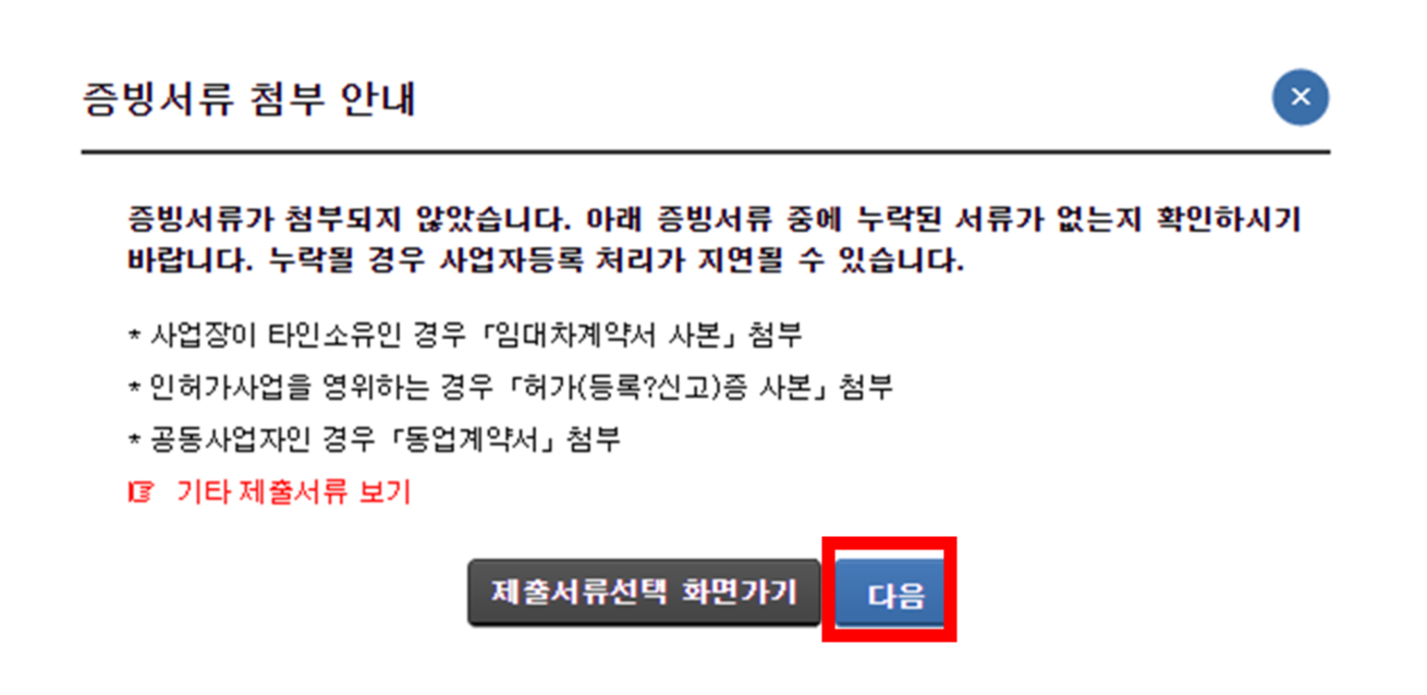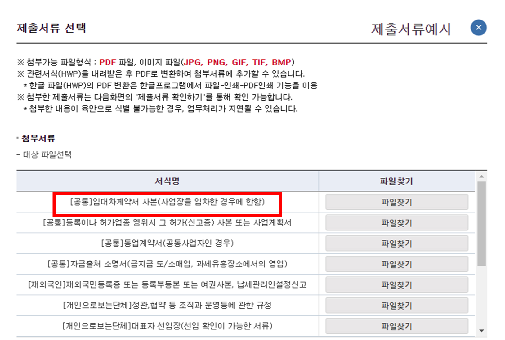 그 다음 제출서류를 선택합니다. 일반적으로는 제출할 게 없고, 전세집이나 상가 사무실 등을 임대한 경우 '임대차 계약서 사본'을 업로드하면 됩니다. pdf 파일이나 jpg, png 등 대표적인 확장자 아무거나 사용하시면 됩니다.