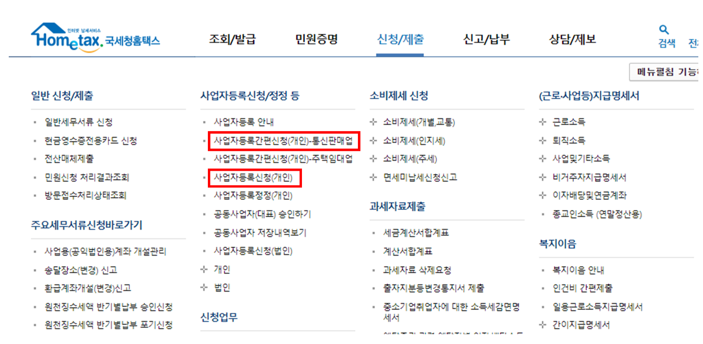 2. 신청/제출 > 사업자등록간편신청(개인)-통신판매업